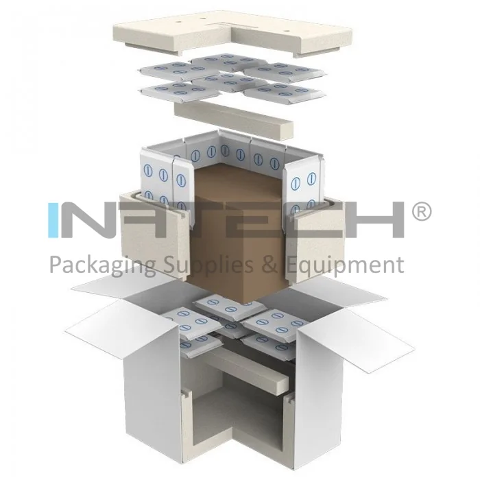 Sistemul este compus din: cutie carton exterior, cutie polistiren, cutie carton interna pentru produse si rezerve pentru racire PCM (material cu schimbare de faza) -21°C din spuma.