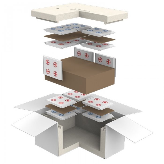 Sistemul este compus din: cutie carton exterior, cutie polistiren, cutie carton interna pentru produse, separator carton si rezerve pentru racire pe baza de apa din spuma.
