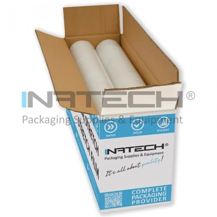 Folia stretch pentru uz manual este livrata sub forma de role ambalate cate 6 buc in cutie de carton.